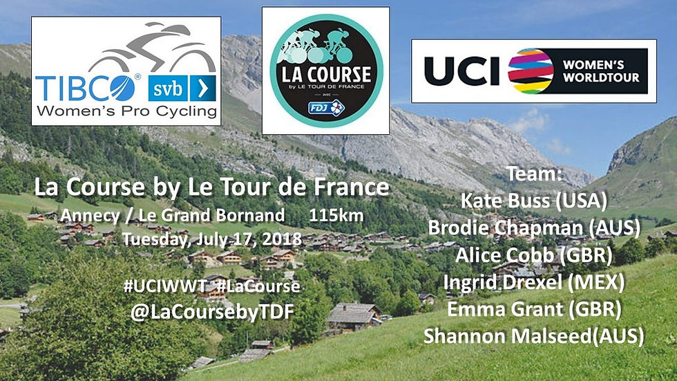 Team TIBCO - Silicon Valley Bank’s roster for La Course by Le Tour de France is Kate Buss (USA), Brodie Chapman (AUS), Alice Cobb (GBR), Ingrid Drexel (MEX), Emma Grant (GBR) and Shannon Malseed (AUS).